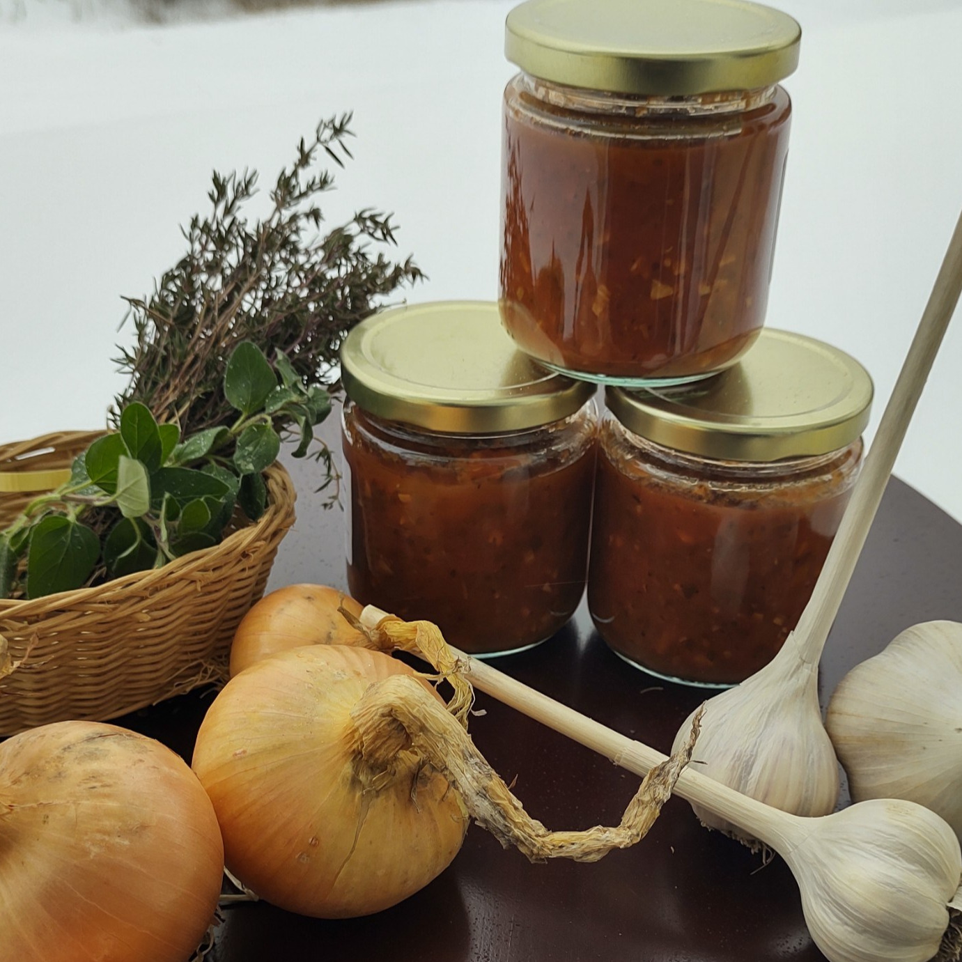 Délicieuse sauce pizza préparée avec nos légumes savoureux et nos fines herbes cultivés ici a la ferme.